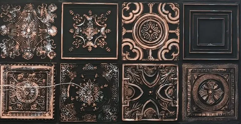 PALACE, klasik saray motiflerinden ilham alan kabartmalı desenleri ve siyah zemin üzerindeki bakır/altın vurgularıyla mekânlara lüks ve teatral bir etki kazandırır. Her panelde farklı rozet ve ornament detaylarının yer alması, yüzeye zenginlik ve “sanatsal” bir derinlik katar; özellikle premium ve dikkat çekici konseptlerde güçlü bir odak noktası oluşturur.